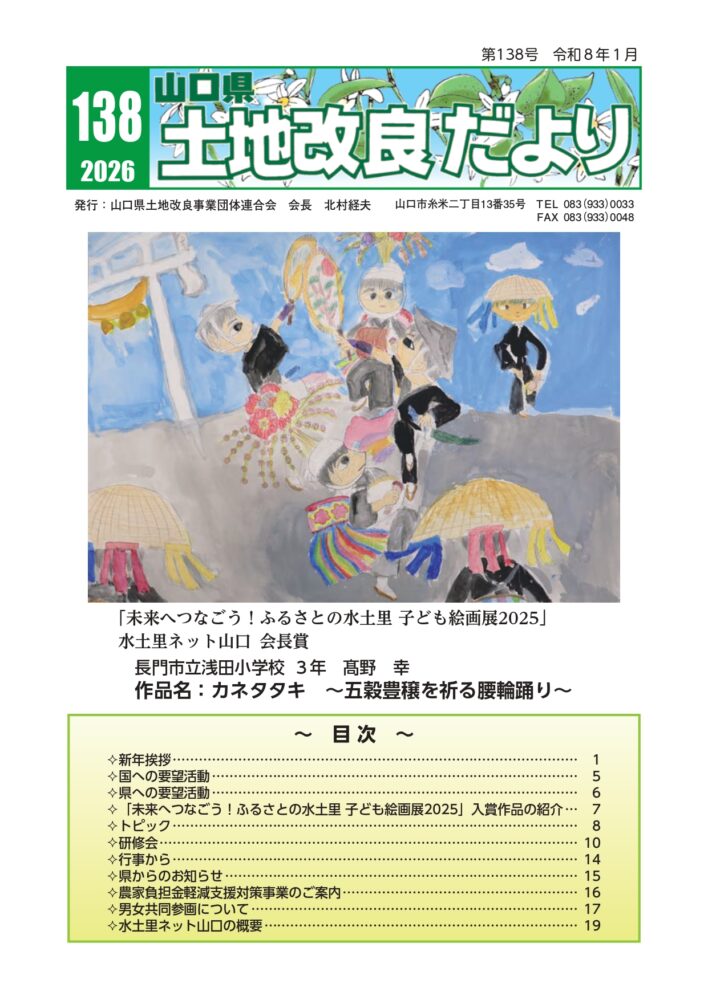 第138号では、山口県土地改良事業団体連合会会長をはじめ、山口県知事及び全国土地改良事業団連合会会長等による新年挨拶や、令和8年度農業農村整備事業予算確保に向けた国・県への要望活動、山口県と共催で行っている現場主体の若手職員研修会や当会独自に行っている大学生向けの講義の様子等を掲載しておリます。